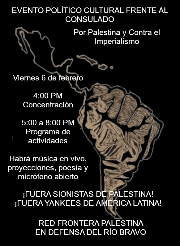 El viernes 6 de febrero del 2026 se llevará a cabo un evento político cultural Por Palestina y Contra el Imperialismo frente a las instalaciones del Consulado Norteamericano en Ciudad Juárez ubicado en el Paseo de la Victoria.